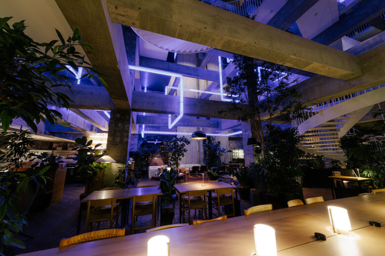 Staying guests are invited to enjoy the LOUNGE in the evening, where the four-story atrium—filled with lush greenery and contemporary art—provides the setting to experience the shifting colors of Leandro Erlich’s Lighting Pipes, along with complimentary drinks and the local specialty, Okirikomi.